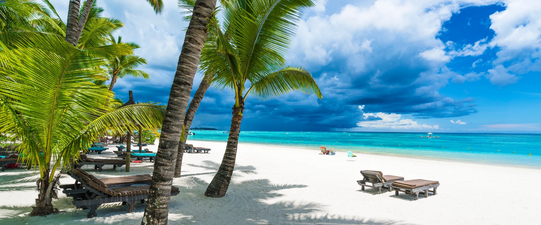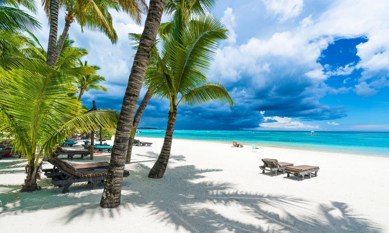 Thailändisches Longtail-Boot an einem weißen Strand vor einem riesigen, bewachsenen Kalksteinfelsen im klaren, türkisen Meer unter blauem Himmel.