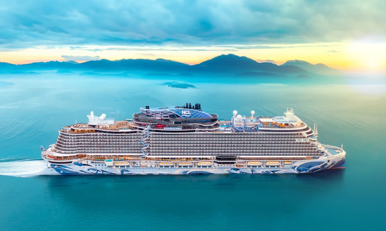 Blick über die Reling eines Kreuzfahrtschiffs auf das offene Meer. Die Kielspur des Schiffs zieht sich in die weite, blaue Ferne.