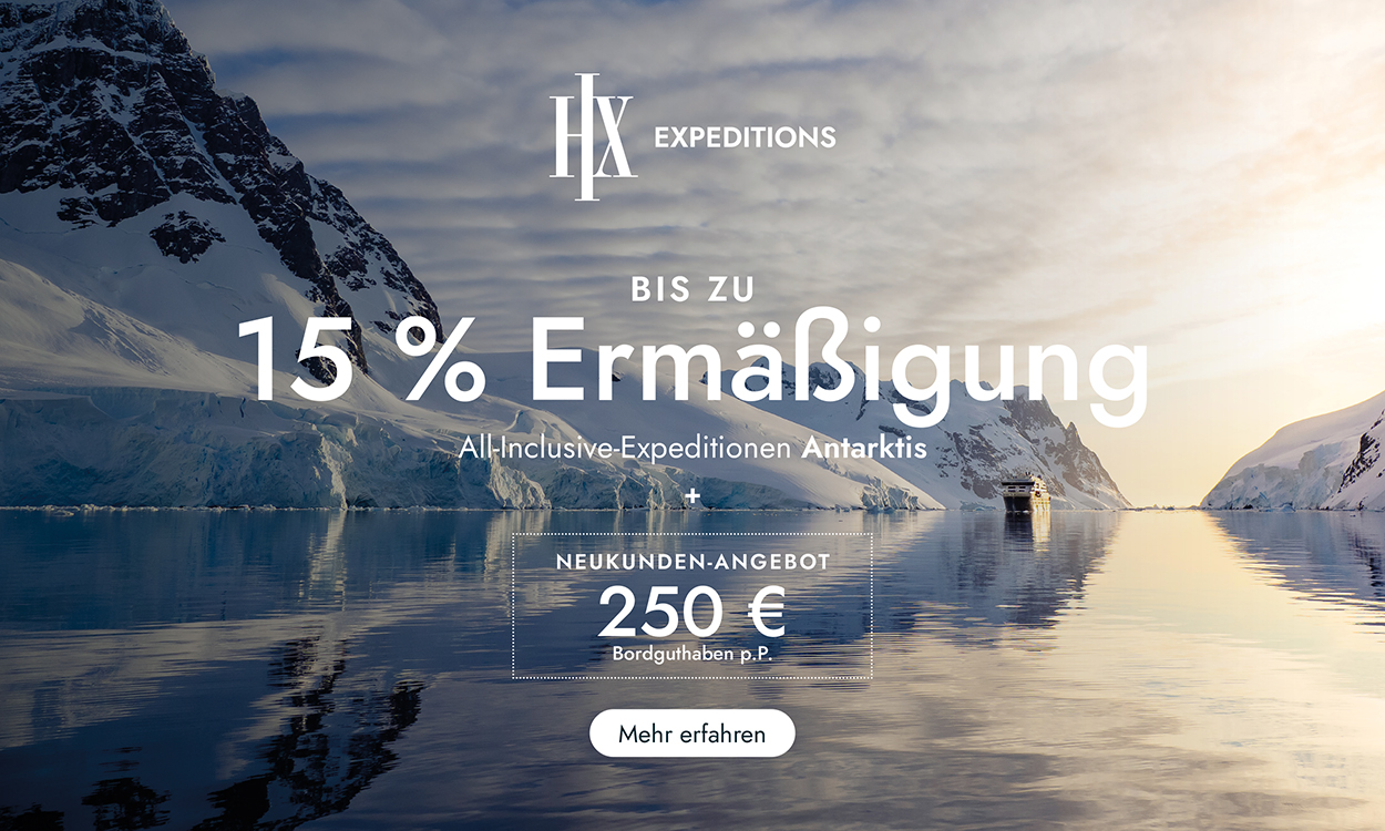 Blick über die Reling eines Kreuzfahrtschiffs auf das offene Meer. Die Kielspur des Schiffs zieht sich in die weite, blaue Ferne.