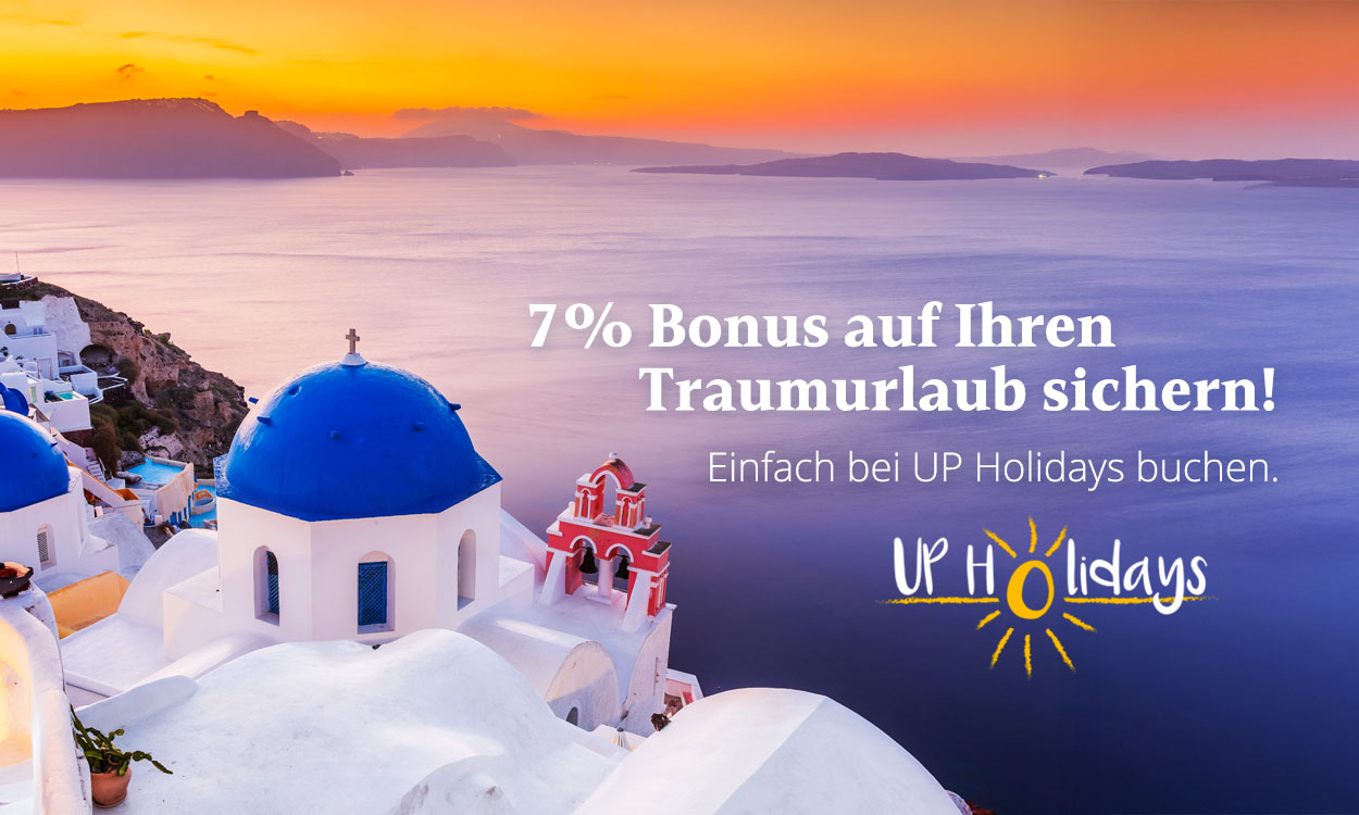 Sonnenuntergang über Santorini mit den ikonischen weißen Häusern und blauen Kuppelkirchen, bewirbt 7% Bonus auf Reisen bei UP Holidays.